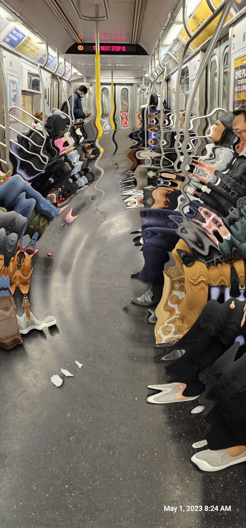Older lady walks through the train, empty cup in hand and is muted by the airpods and the desensitization of the riders.