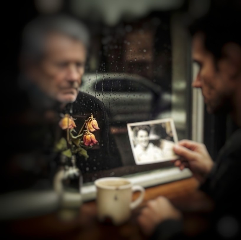 The photo in the window has faded, rose stems sag in the vase, petals have fallen onto the floor, a cup of cold forgotten coffee…